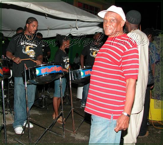 Renegades Steel Orchestra Elder Renwick 'Rico' Alexander in front of the orchestra